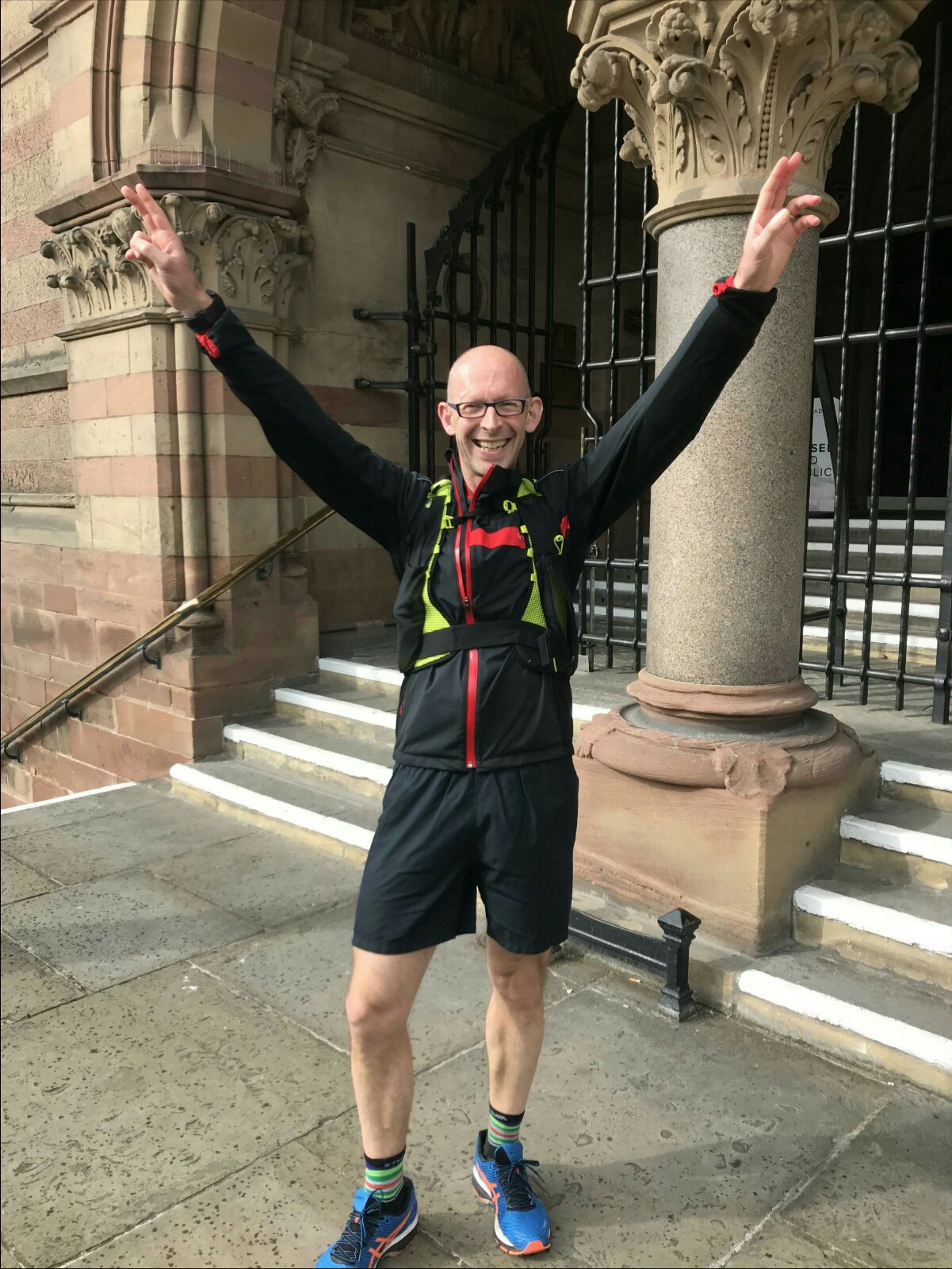 I am embarrassed to say that at around 6.15am, myself, Martin and Rob stopped for a short ‘pitstop’ at a well known food retailer – here, I felt very faint, struggled to eat anything, was almost sick and had a ‘fight ‘ with a toilet role 🙄. Enough said about that……..At 9.02am, I arrived back at The Town Hall and to the theme of Rocky, hurled myself up the steps before celebrating!